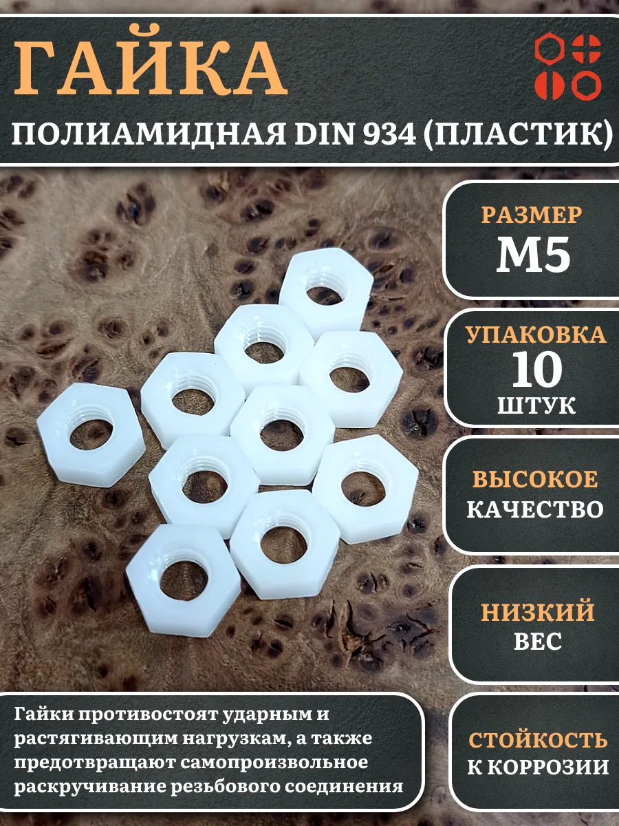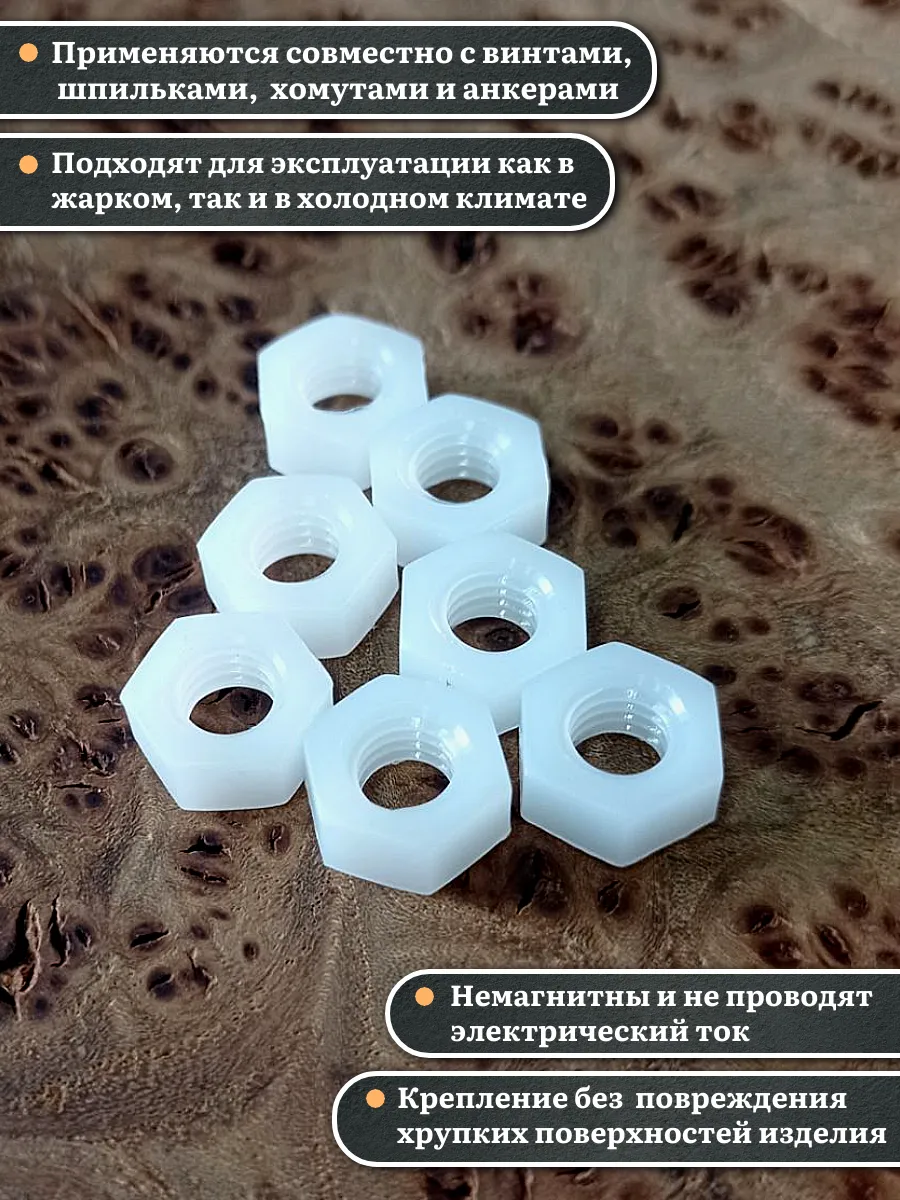 Гайки из пластика, изготовленные из полиамида и соответствующие стандарту DIN 934, используются для предотвращения самопроизвольного раскручивания резьбовых соединений. Вместе с ними применяют полиамидные шайбы, которые служат в качестве уплотнительной прокладки. Это позволяет увеличить площадь контакта и защитить соединяемые детали от повреждений.