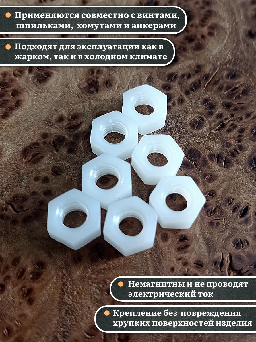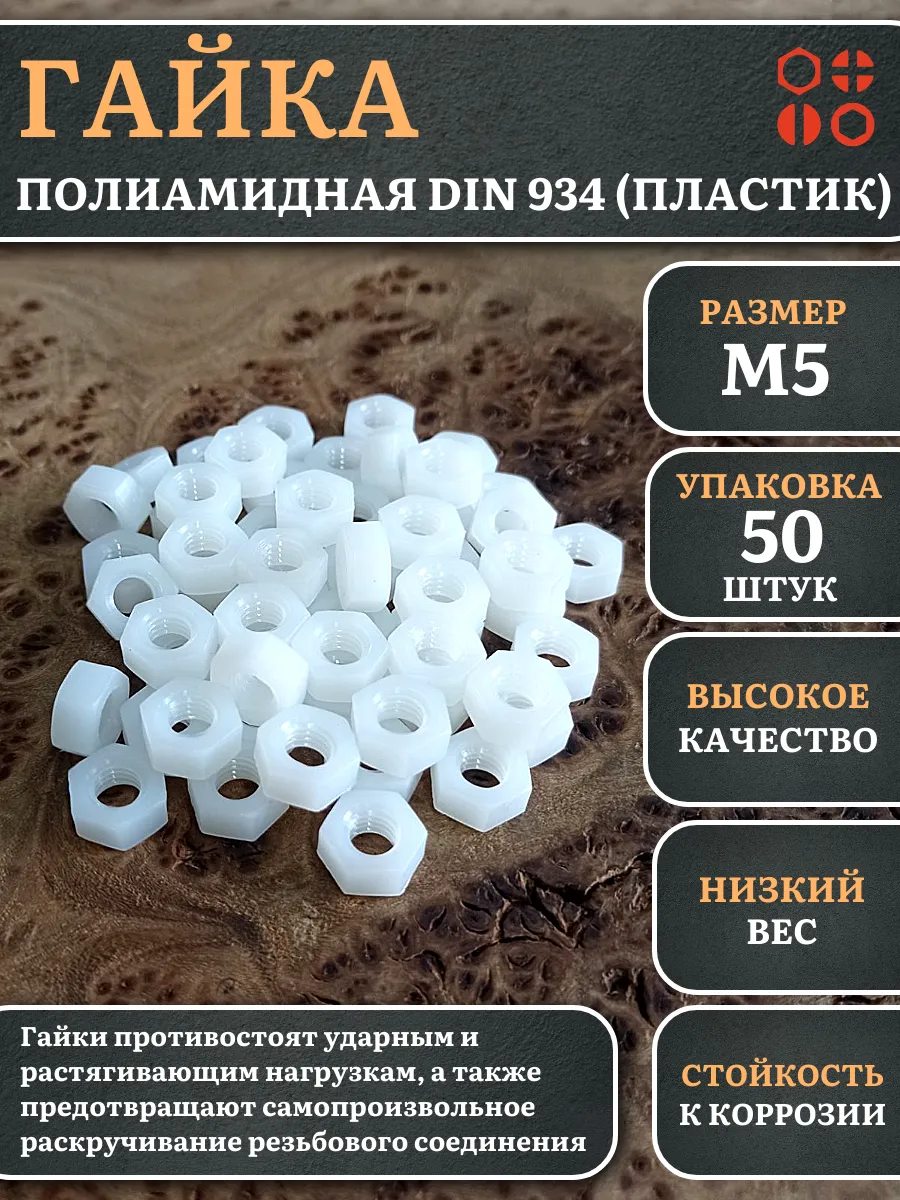Гайки из пластика, изготовленные из полиамида и соответствующие стандарту DIN 934, используются для предотвращения самопроизвольного раскручивания резьбовых соединений. Вместе с ними применяют полиамидные шайбы, которые служат в качестве уплотнительной прокладки. Это позволяет увеличить площадь контакта и защитить соединяемые детали от повреждений.