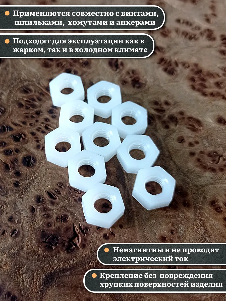 Гайки из пластика, изготовленные из полиамида и соответствующие стандарту DIN 934, используются для предотвращения самопроизвольного раскручивания резьбовых соединений. Вместе с ними применяют полиамидные шайбы, которые служат в качестве уплотнительной прокладки. Это позволяет увеличить площадь контакта и защитить соединяемые детали от повреждений.