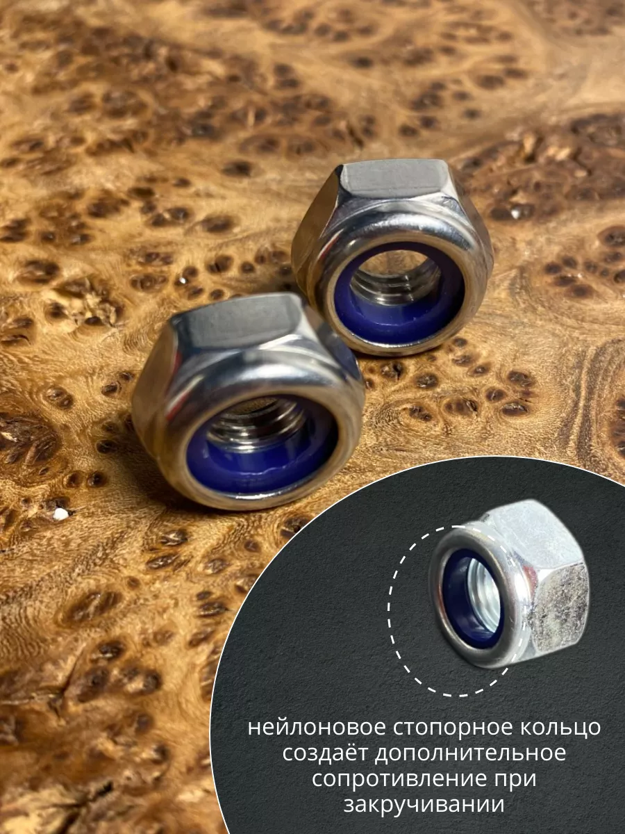 Стопорная самоконтрящаяся гайка DIN 985 с нейлоновым кольцом из нержавеющей стали А2 используется в машиностроении, приборостроении и прочих промышленных, производственных, строительных отраслях совместно с болтами, винтами или шпильками соответствующего размера резьбы.