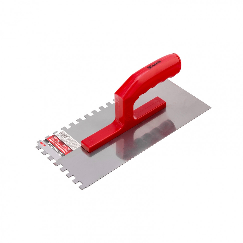 Стальная гладилка Matrix 86778 размером 280 x 130 мм, с зубьями 8 x 8 мм, зеркальной полировкой и пластмассовой ручкой, поможет ровно нанести штукатурку или строительный раствор. Зубчатые края гладилки обеспечивают правильное распределение плиточного клея для прочной фиксации плитки.