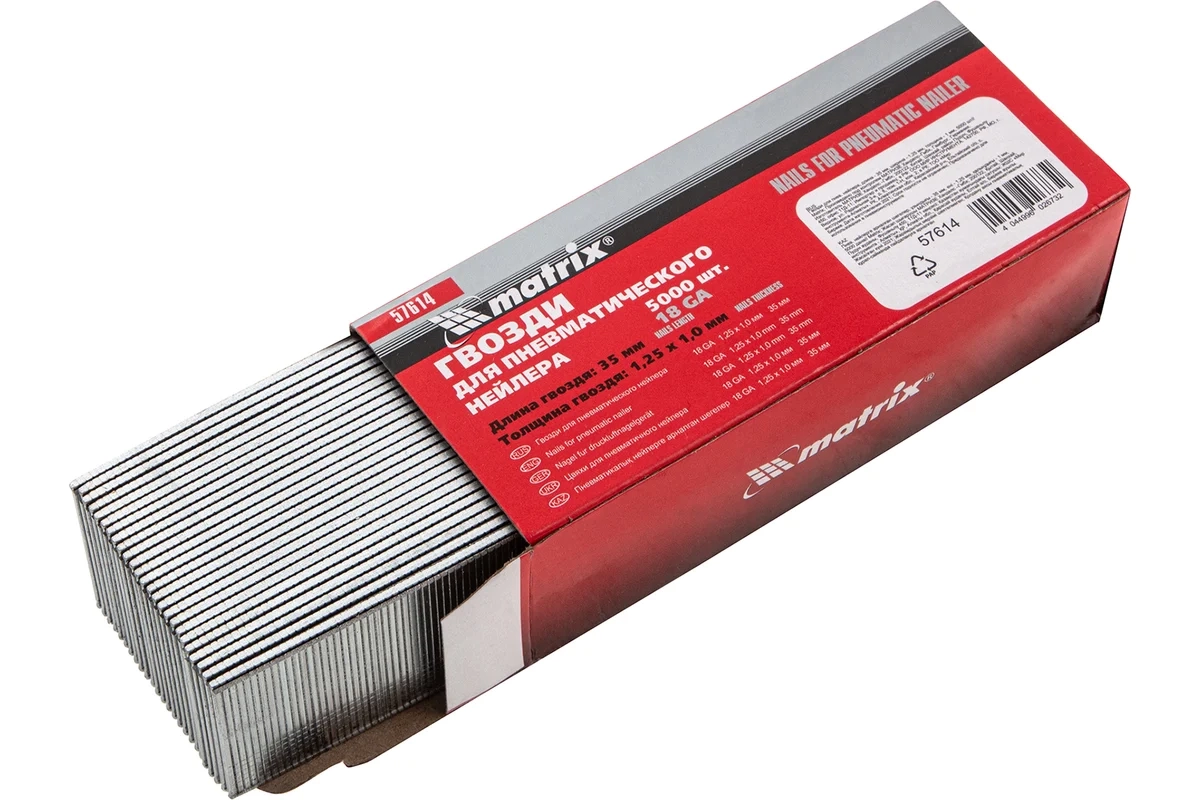 Гвозди Matrix 57614, тип 16GA, предназначены для пневматических нейлеров, работающих с оснасткой размером 35 х 1,25 х 1 мм. Они обеспечивают быстрое и точное соединение деревянных деталей, помогают зафиксировать на деревянных и металлических поверхностях ткань, элементы дизайна, фурнитуру.