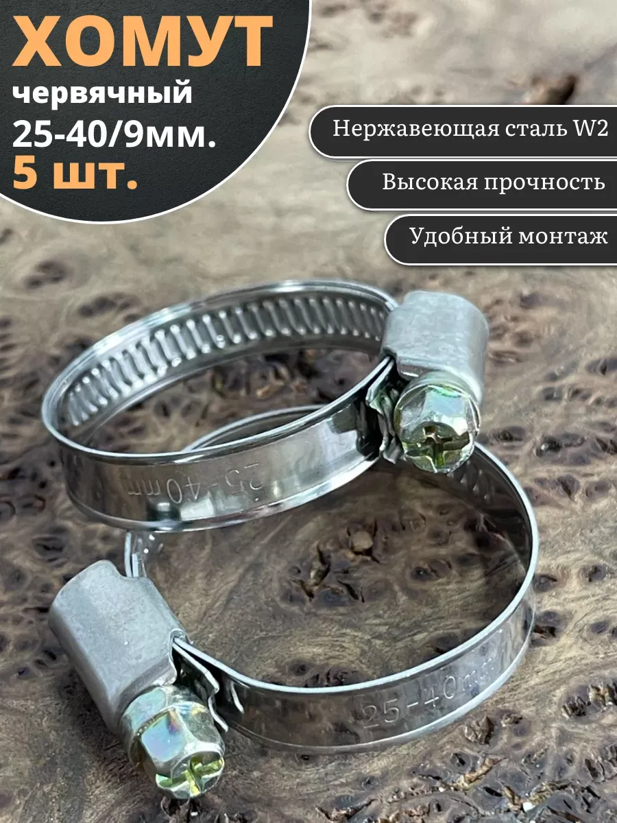 Хомут стяжка червячный 25-40/9 W2 нержавейка, 5 шт.