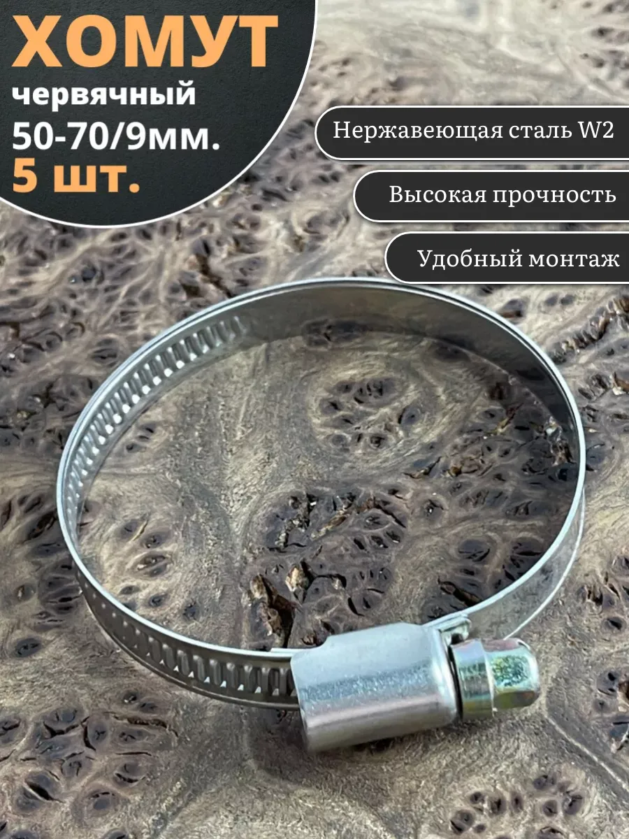 Хомут стяжка червячный 50-70/9 W2 нержавейка, 5 шт.