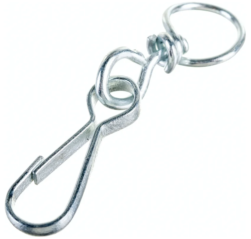 Карабин DIN4293 тип 125 с вертлюгом для использования в бытовых целях.Применяются для соединения элементов, один из которых длинномерное приспособление (шнур, веревка, лента, стропа). Также карабины с вертлюгом используют в туристических снаряжениях для фиксации легких конструкций, например, ламп в палатке.