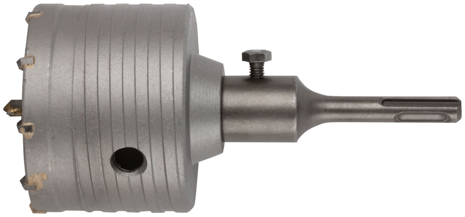Хвостовик 110 мм. В сборе. Для перфоратора. Для ударного сверления отверстий в бетонных, кирпичных и каменных стенах. Материал: хвостовик и центрирующее сверло легированная инструментальная сталь с добавлением хрома; корпус инструментальная сталь; твердосплавные резцы из карбида вольфрама. Упаковка: пластиковый подвес.