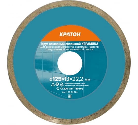 Круг алмазный сплошной супертонкий для УШМ (125 мм; 1.1 мм) Кратон 1 08 04 024 предназначен для работы с керамогранитом, кафелем, глазурованной керамической плиткой и твердой керамикой. Круг алмазный сплошной бренда Кратон Керамика предназначен для работы с бетоном, камнем, используется для керамической плитки. Оснастка обеспечивает точный и чистый рез с минимальными усилиями со стороны пользователя. Рабочая кромка оснащена алмазной крошкой, нанесенной путем спекания, что обеспечивает высокую производительность. Алмазный круг с посадкой 22,2 мм совершает рез в материале шириной 1,1 мм. Диск используется с угловыми шлифмашинками, с посадочным диаметром 125 мм. Оснастка изготовлена из высокопрочного материала, рассчитана на длительный срок пользования без поломок и деформаций.