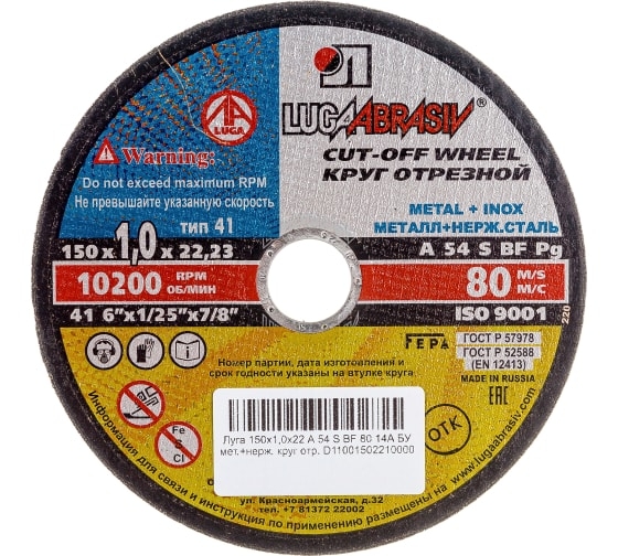 Круг отрезной мет+нерж 150х1,0х22 мм A 54 S BF 80 Луга