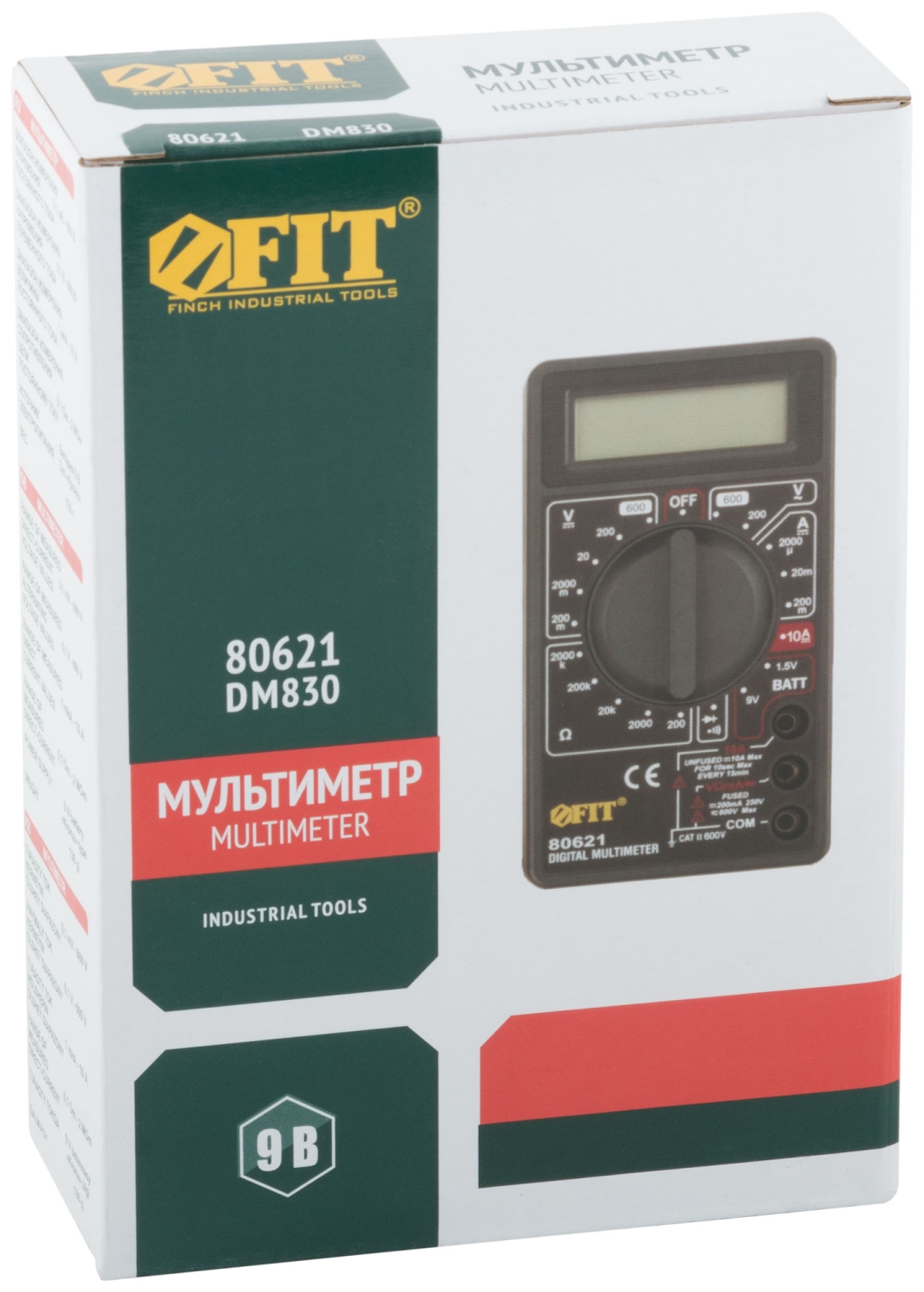 Подает звуковой сигнал в режиме проверки целостности электроцепи. Индикация разряда батареи. Батарея 9В и провод с наконечником и щупом в комплекте. Диапазон измерения напряжения постоянного тока — 0,1мВ-600В. Диапазон измерения напряжения переменного тока — 0,1В-600В. Диапазон измерения величины постоянного тока — 1мкА-10А. Диапазон измерения сопротивления цепи постоянному току — 0,1Ом-2МОм. Мультиметр цифровой FIT оборудован жидкокристаллическим дисплеем. Предназначен для измерения напряжения постоянного тока VDC, напряжения переменного тока VAC, постоянного тока DC и переменного тока АС, сопротивления, проверки диодов, целостности цепи. Это превосходный измерительный прибор, который удобен и прост в эксплуатации. [0,1мВ-600В; 0,1-600В; 1мкА-10А; 0,1Ом-2МОм]