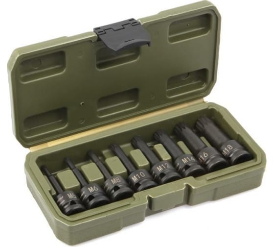 Набор бит-головок ударных Spline (8 шт; М5-М18; 1/2'') Дело Техники 664678 изготовлен из хромомолибденовой стали CrMo методом горячей штамповки с последующей термообработкой. Головки закалены, защищены от коррозии фосфатированием. Применяются для работы с ударным электро-, пневмоинструментом и ручным приводом. Отлично подходят в качестве использования ударных головок для шиномонтажа и в автомастерской.
