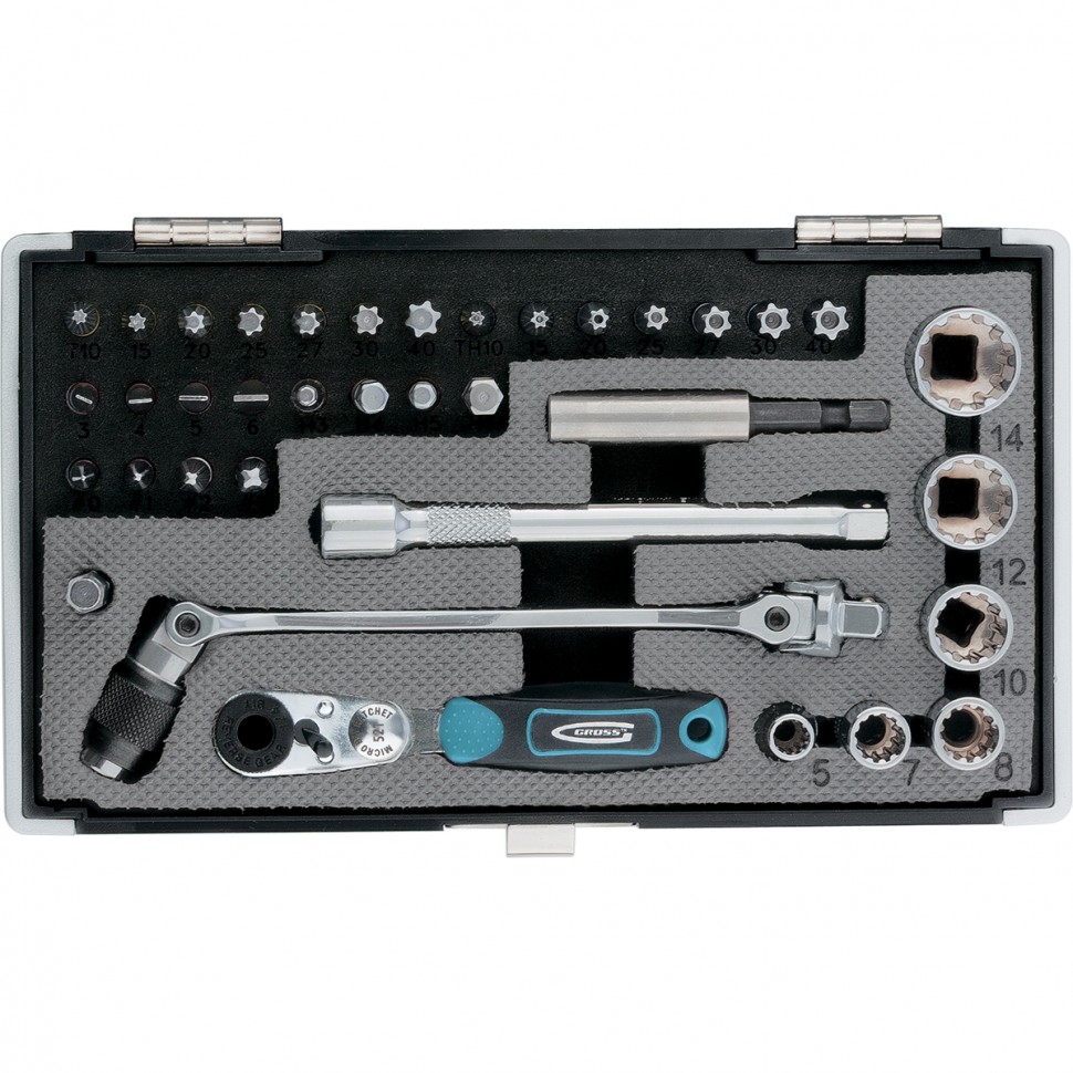 Набор бит и торцевых головок, карданный ключ, трещотка, адаптер, 1/4", S2, 37 шт Gross