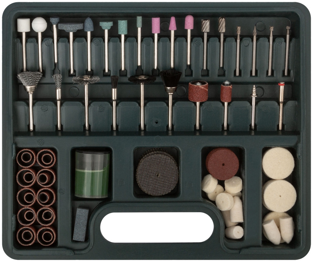Для гравировальной машины. В наборе: шарошки по металлу и камню, корщётки-насадки из стальной волнистой проволоки, корщётки-насадки нейлоновые, держатели для шлифовальных и отрезных мини-кругов; держатель для фетровых кругов; фетровые круги; шлифовальные мини-круги; отрезные мини-круги; паста полировочная; шлифовальные кольца. Упаковка: пластиковая коробка.