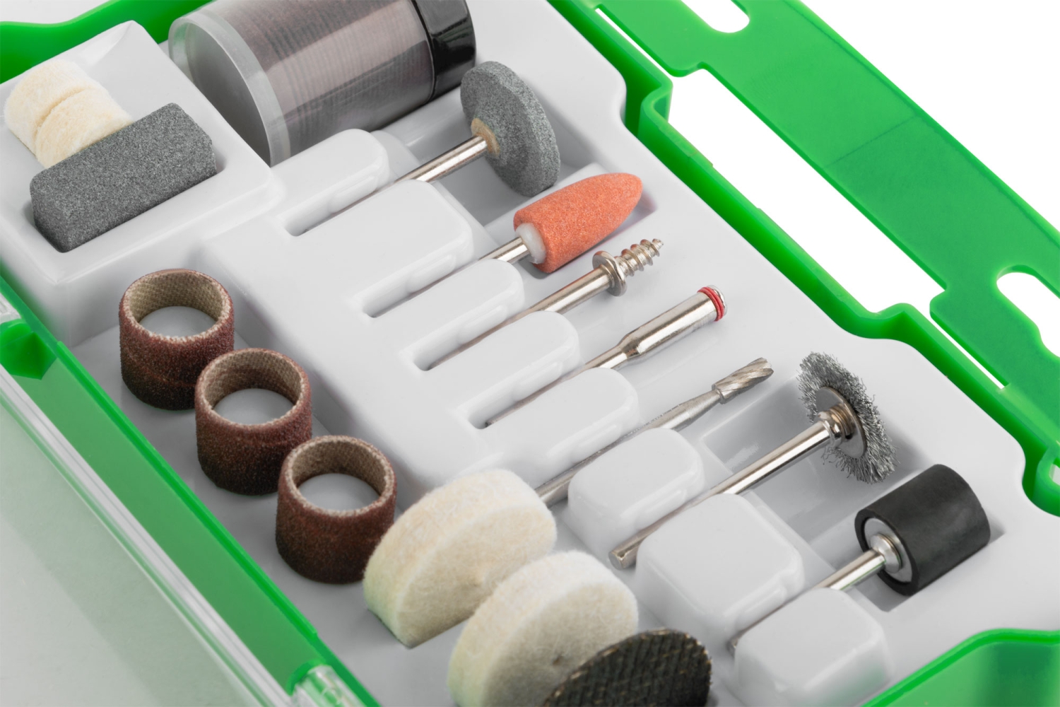 Для гравировальной машины. Для обработки различных материалов. В наборе: фетровые насадки, штифты для фетровых насадок и отрезных кругов, держатель для наждачных трубок, наждачные трубки, мини корщетка-насадка тип «колесо», шарошки-мини по металлу, круги отрезные абразивные. Упаковка: пластиковый кейс.