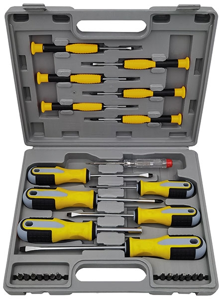 «Старт». В наборе: 5 отверток, 6 отверток для точных работ, 1 индикаторная отвертка, 1 отвертка с магнитным держателем для бит, 14 хром-ванадиевых бит. Упаковка: пластиковый чемодан.