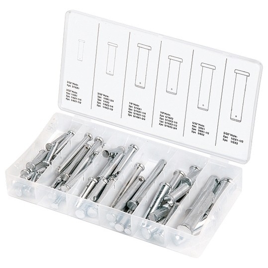Набор штифтов с головкой и отверстием под шплинт СИБРТЕХ 60 предметов 47612 имеет в своем ассортименте наиболее ходовые размеры. Штифты имеют уплощенную головку и отверстие в ножке под шплинт. Крепеж выполнен из стали. Кейс из пластика оснащен отсеками под каждый размер.