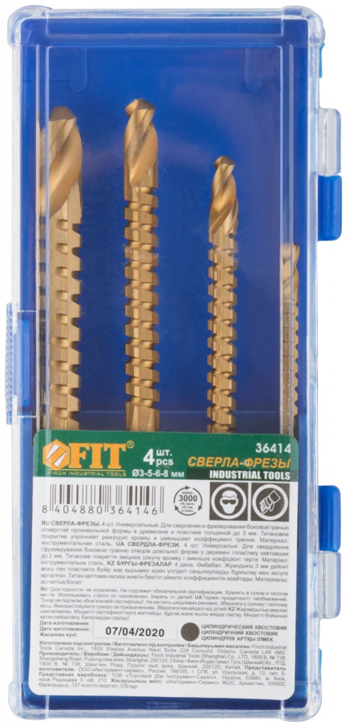 Сверло-фреза универсальное титановое покрытие, набор 4 шт. (3; 5; 6; 8 мм).Универсальное. Для высверливания и выпиливания боковой гранью отверстий произвольной формы в дереве и пластмассе толщиной до 3 мм. Цилиндрический хвостовик. Титановое износостойкое покрытие. Упаковка: пластиковая коробка.