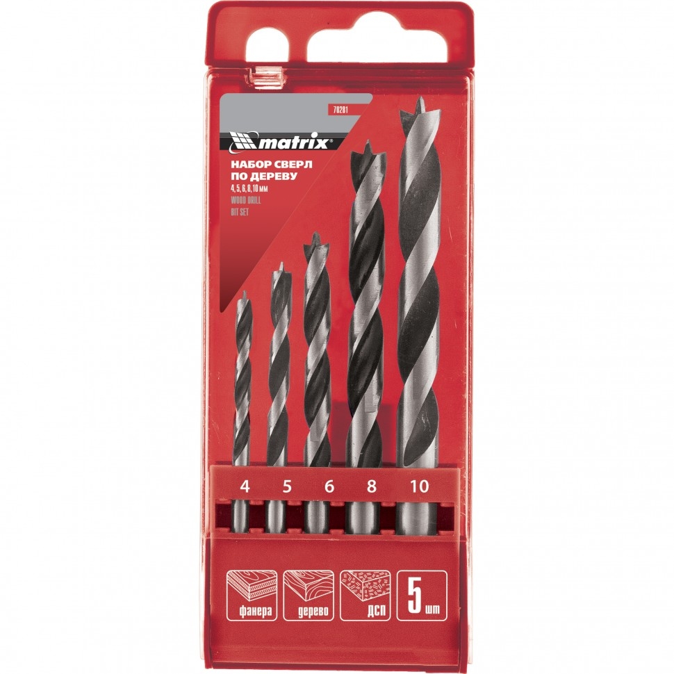 Набор сверл по дереву Matrix 70281 с цилиндрическим хвостовиком, 5 шт. в упаковке, позволяет получать отверстия диаметром 4-5-6-8-10 мм в древесине любой твердости. Используется во время ремонтных, отделочных и строительных работ, рассчитан на интенсивное профессиональное использование. Прочность и долговечность — элементы набора изготовлены из инструментальной стали и закалены до твердости 38-48 HRC.