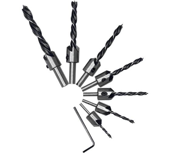 Набор сверл с зенкером 3-4-5-6-7-8-10 мм 7 шт. по дереву, пластику, ПВХ, походит для создания различных углублений для потайного размещения крепежных изделий.