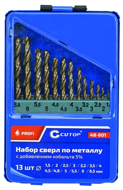 Набор сверл по металлу с кобальтом 5% в металлической коробке; 2-8 мм (через 0,5 мм), 13 шт., cutop profi для профессионального использования. Класс точности А1. Цилиндрический хвостовик. Угол заточки 135 градусов. Предназначено для сверления отверстий в углеродистых и легированных сталях, серых и ковких чугунах, цветных металлах и пластике. Материал: быстрорежущая HSS сталь c добавлением кобальта 5% (P6M5K5).