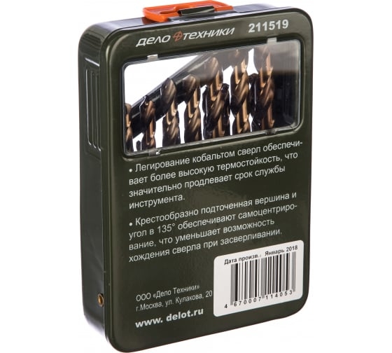 Набор свёрл Дело Техники 211519 предназначен для выполнения сквозных и глухих отверстий в легированной и нелегированной стали, сером чугуне, металлокерамическом сплаве на основе железа, ковком чугуне, цветном металле. Сверла изготовлены из быстрорежущей инструментальной стали с добавлением 8% кобальта для повышения термостойкости и износостойкости. Работают в правом направлении. Сверла поставляются в специальном боксе.