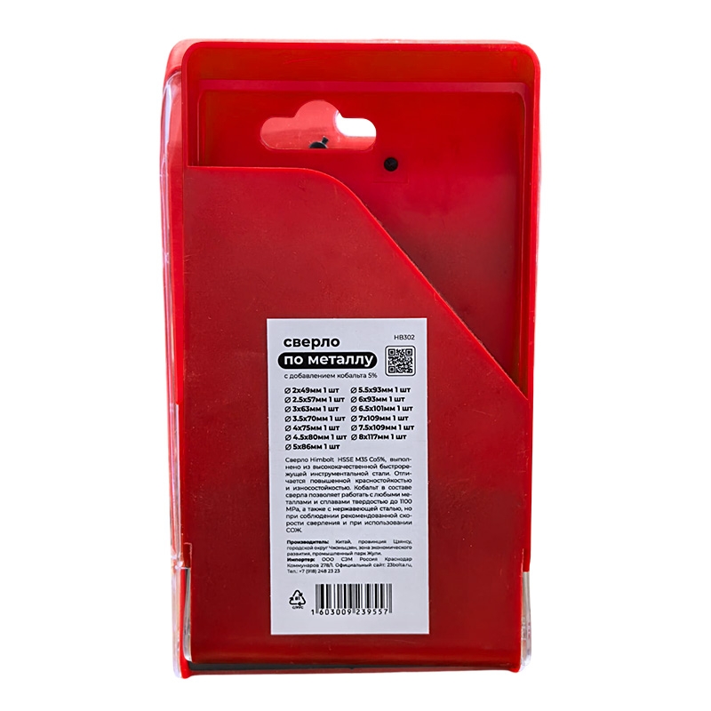 Набор сверл по металлу с кобальтом 5% P6M5K5 2-8(через 0,5) мм HIMBOLT 13 шт.пласт.бокс выполнен из высококачественной быстрорежущей инструментальной стали. Отличается повышенной красностойкостью и износостокойстью. Кобальт в составе сверла позволяет работать с любыми металлами и сплавами твердостью до 1100 МРА, а также с нержавеющей сталью, но при соблюдении рекомендованной скорости сверления и при использовании СОЖ.
