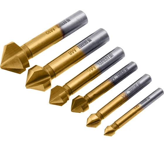 Набор зенковок M3-M10 Denzel 72313, 6 шт. из стали HSS, в комплекте с металлическом кейсом, применяется при работе с электрическими дрелями и сверлильными станками. Зенковки используются для выполнения конических отверстий и снятия фасок в стали, цветных металлах, пластике и древесине.