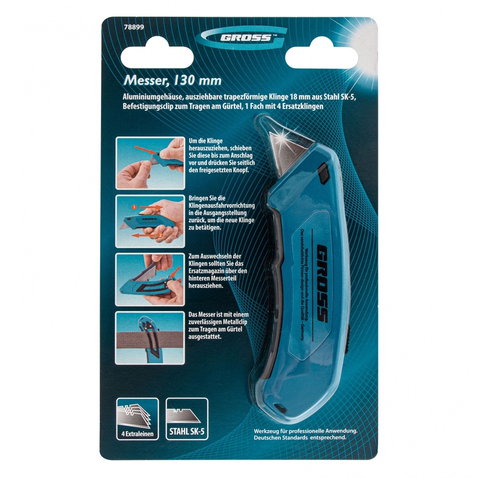 Нож Gross 78899 из стали SK-5, длиной 130 мм, с алюминиевым корпусом, выдвижным трапециевидным лезвием шириной 18 мм, клипсой для ремня и 4 лезвиями, — профессиональный инструмент для разрезания картона, линолеума, обоев, кожи и других мягких материалов. Благодаря алюминиевому корпусу он отличается повышенной прочностью и коррозионной стойкостью, выдерживает длительное и частое использование. Нож будет полезен при проведении ремонтных и отделочных работ, подойдет и для бытового использования. Износостойкость — лезвие толщиной 0,6 мм долго сохраняет режущую способность, т.к. изготовлено из высокопрочной японской стали SK-5.