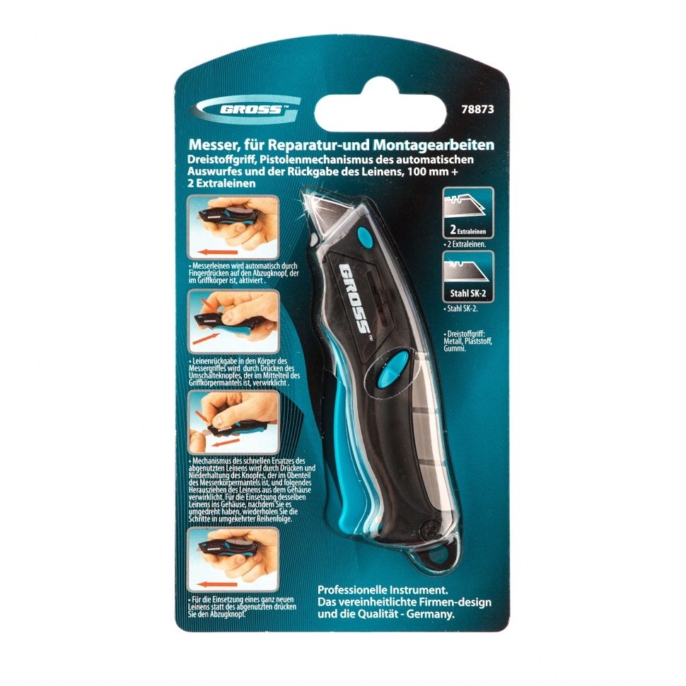 Нож рем-монтажный мини 100 мм. 3-хкомп.рук.,авто выброс/возврат лез.пистол.типа, 2з.л Gross