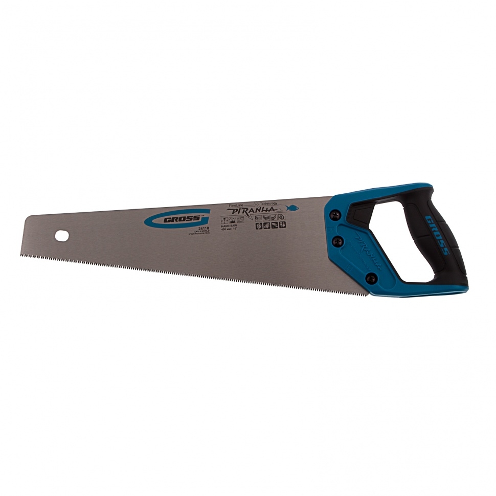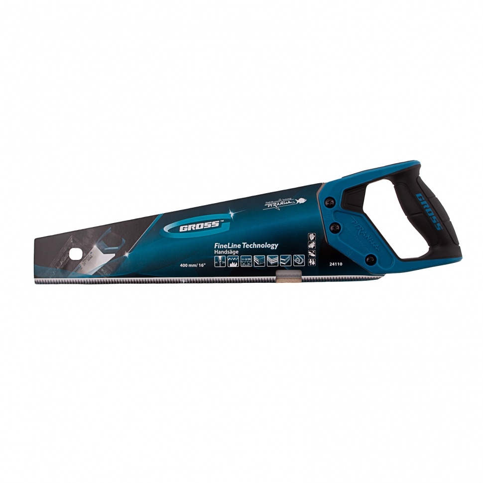 Ножовка по дереву Gross PIRANHA 24110 с полотном длиной 400 мм, калеными зубьями с 3D-заточкой и шагом 11-12 TPI, 2-компонентной рукояткой, предназначена для распиловки заготовок из древесины, ДСП, ДВП, МДФ и ламината, а также из пластических материалов, таких как пенополистирол и полиуретан. Может производить продольный и поперечный распил. Мелкие зубья с шагом 11-12 TPI позволяют выполнять точный и чистый рез. Ножовка обладает высокой производительностью благодаря трехгранной заточке зубьев. Инструмент используется в столярном деле. Надежность — полотно изготовлено из высококачественной японской стали SK-5, а рукоятка — из ударопрочного ABS-пластика.