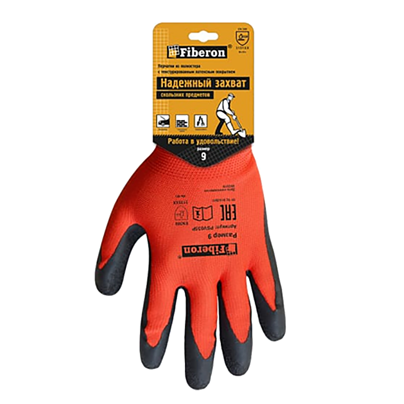 Перчатки Fiberon Монтаж из полиэстера с текстурированным латексны обеспечивают надёжный захват предметов, что особенно важно при проведении автомобильных работ, строительстве и работе с садовым инвентарём. Рельефное покрытие предотвращает скольжение влажных или скользких предметов и снижает нагрузку на ладонь. Имеют антискользящее покрытие.