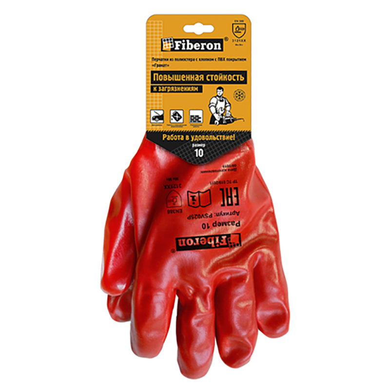 Перчатки Fiberon из полиэстера с добавлением хлопка и с ПВХ покрытием подходят для работ, которые связаны с повышенным загрязнением: например, для работы с отделочными растворами, в автосервисе или со строительными материалами, имеющими абразивную поверхность. Благодаря полному покрытию вся кисть защищена от загрязнений. Покрытие из ПВХ сохраняет эластичность даже при низких температурах.