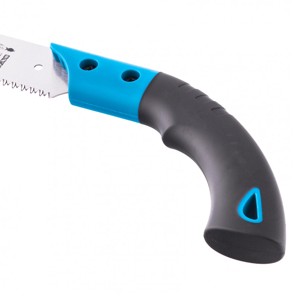 Универсальная пила по дереву Gross PIRANHA 23612 с полотном длиной 330 мм, калеными зубьями с шагом 9-10 TPI и 3D-заточкой, с 2-компонентной рукояткой, используется во время работ в саду и кемпинге. С ее помощью можно обрезать сучья или заготовить материал для растопки. Также пила подходит для распиловки фанеры, ДВП, ПВХ. Выполняет продольный и поперечный распил. Зубья с шагом 9-10 TPI и трехгранной заточкой обеспечивают высокую производительность инструмента. Благодаря заточке зубьев характеристики режущей кромки соответствуют всем международным стандартам. Пила комплектуется пластиковым пеналом, что исключает риск получения травмы во время хранения или транспортировки инструмента. Полотно из высококачественной японской стали SK-5 твердостью 48-52 HRC характеризуется прочностью и износостойкостью.