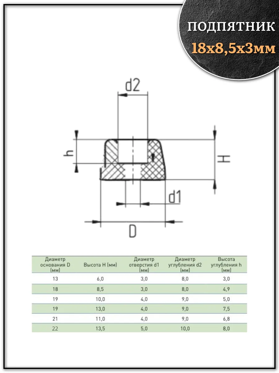 | Подпятник круглый мебельный с отверстием 18х8,5х3 мм, 10 шт | 18-0220ф10 | 1 шт. |