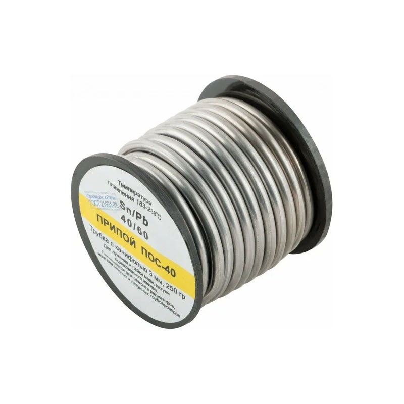 Припой с канифолью D 3 мм, 250 г, POS40 катушка предназначена для лужения и пайки меди, латуни, оцинкованного железа. Подходит для ремонта радиаторов, монтажа медных и латунных трубопроводов, ремонта электроаппаратуры. Температура плавления 183-238С. Имеет форму трубки с канифолью.