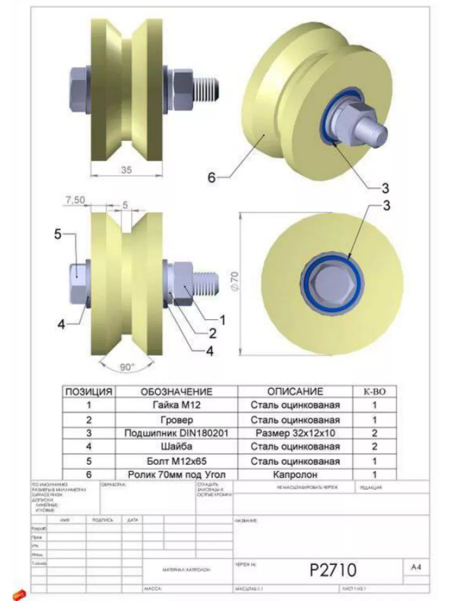 Ролик для ворот Р2710, d70мм под угол , капролон 2 шт.