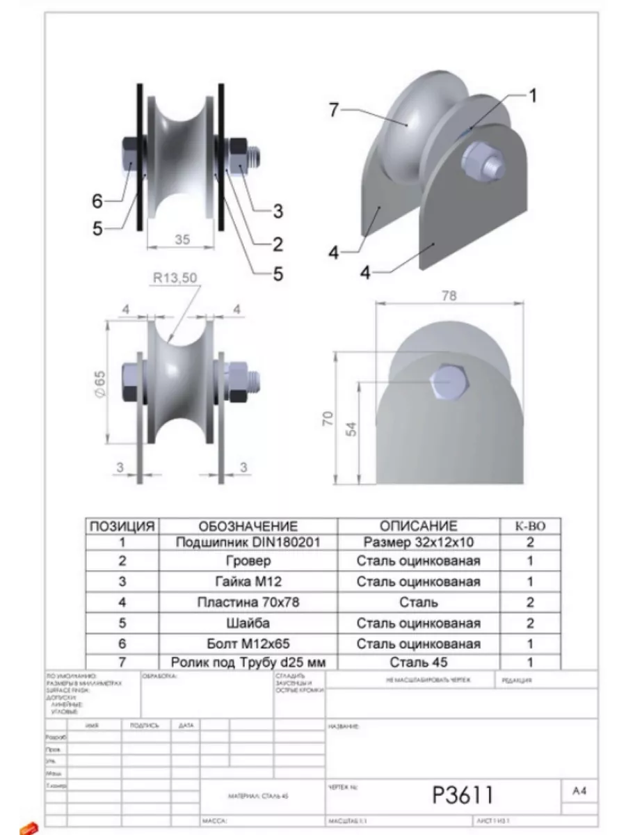 Ролик на пластинах Р3611, d65мм, под трубу 3/4 d25, 2 шт.