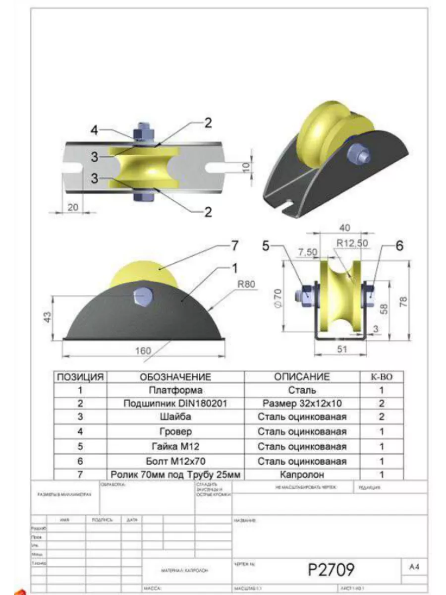 Ролик на платформе d 70 мм, под трубу 3/4, капролон,4 шт