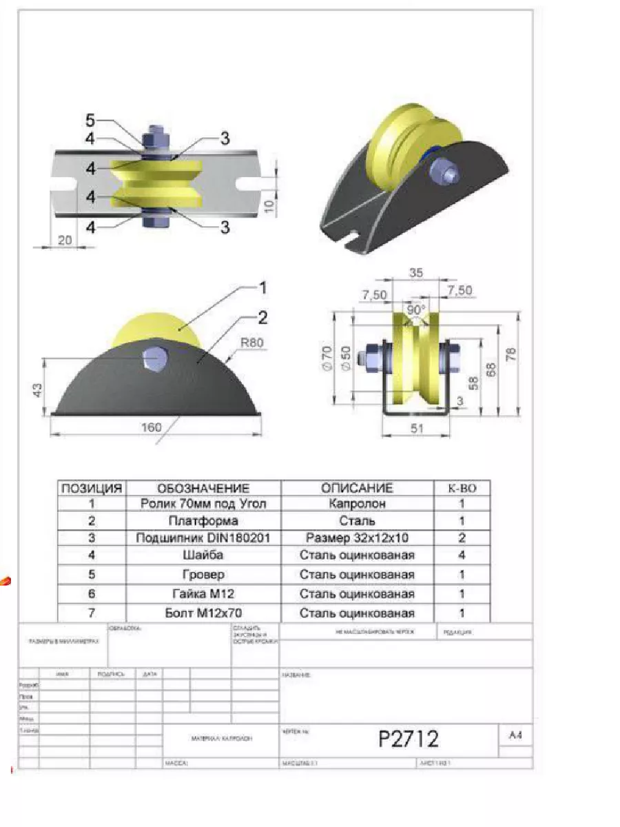 Ролик на платформе d70мм, под угол шир.35мм,капролон 4 шт.