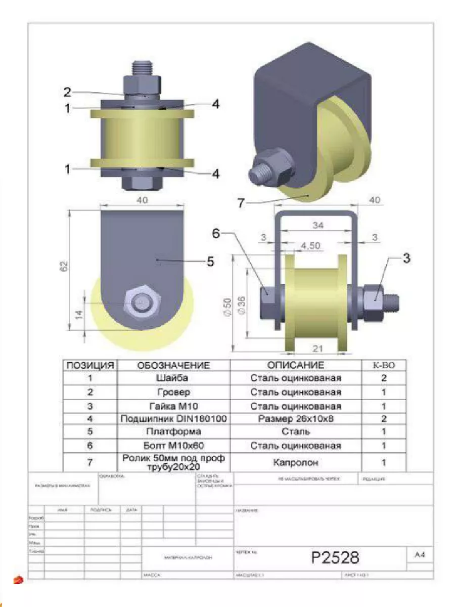 Ролик на платформе Р2528, d50мм, под трубу 20х20, 2 шт.