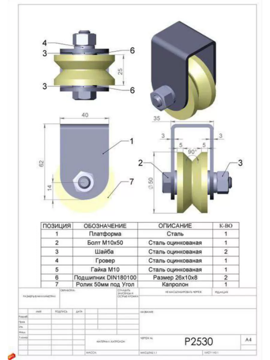 Ролик на платформе Р2530 , d50мм , под угол , капролон 2 шт.
