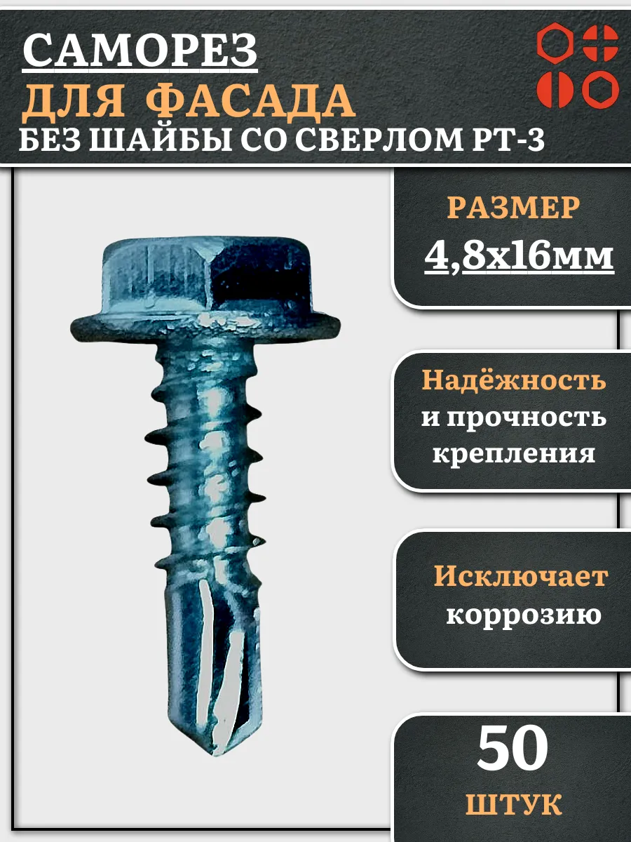 | Саморез без шайбы для фасада со сверлом 4,8х16 РТ-3, 50 шт. | сф4816фф50 | 1 шт. |