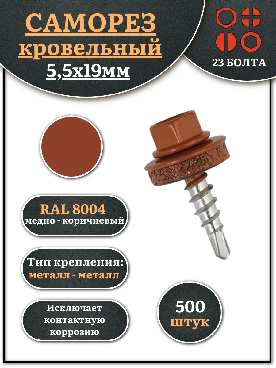 Саморез кровельный, 5,5х19 медно-коричн. RAL8004 500 шт