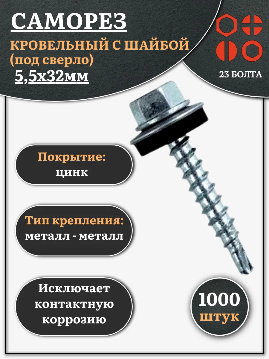 | Саморез кровельный 5,5x32 мм с шайбой (под сверло),ОЦ 500 шт | B03005503237207ф500 | 1 шт. |