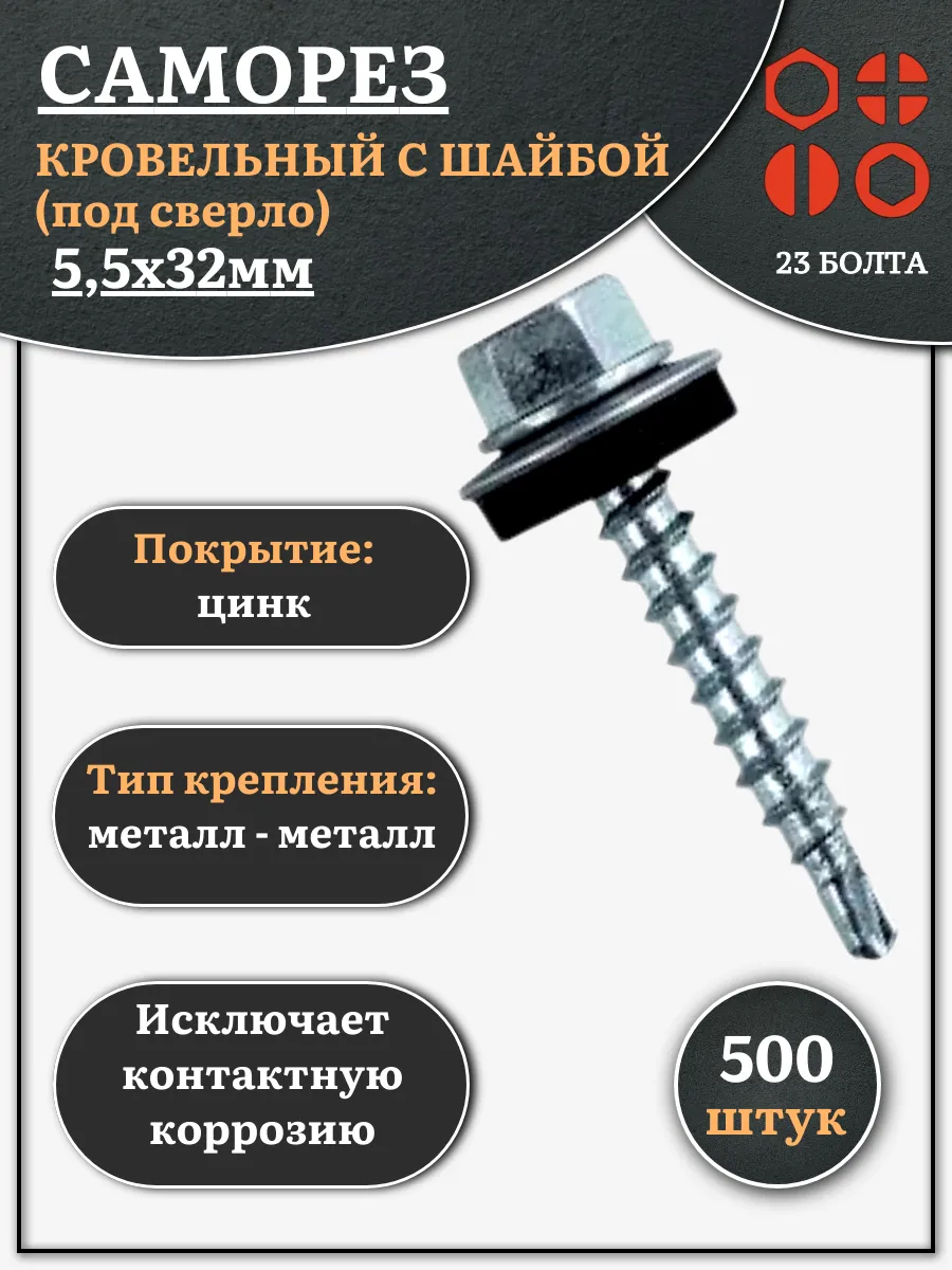 Саморез кровельный 5,5x32 мм с шайбой (под сверло),ОЦ 500 шт