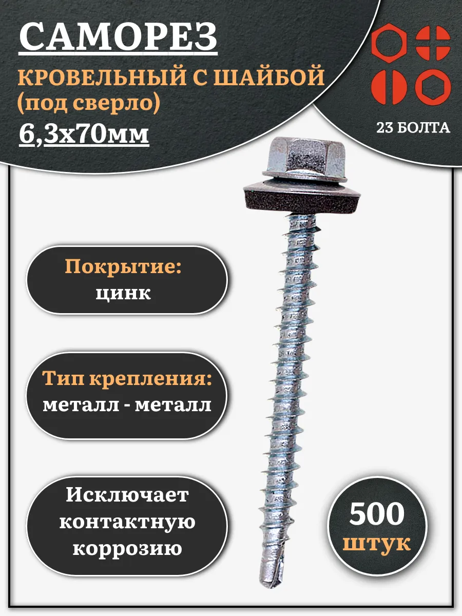 Саморез кровельный 6,3х70 мм с шайбой (под сверло),ОЦ 500шт.