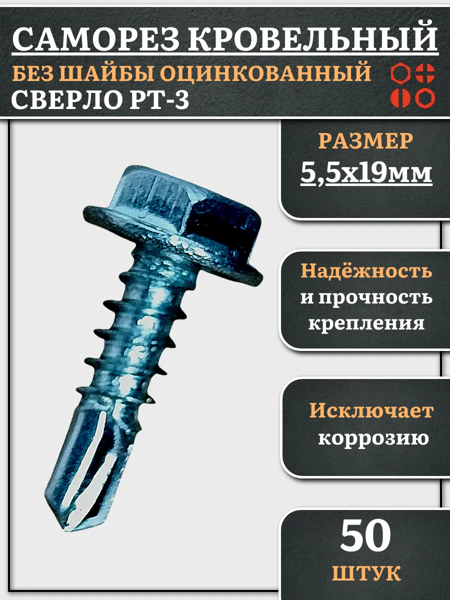 Саморез кровельный без шайбы, 5,5х19 ОЦ сверло РТ-3, 50 шт.