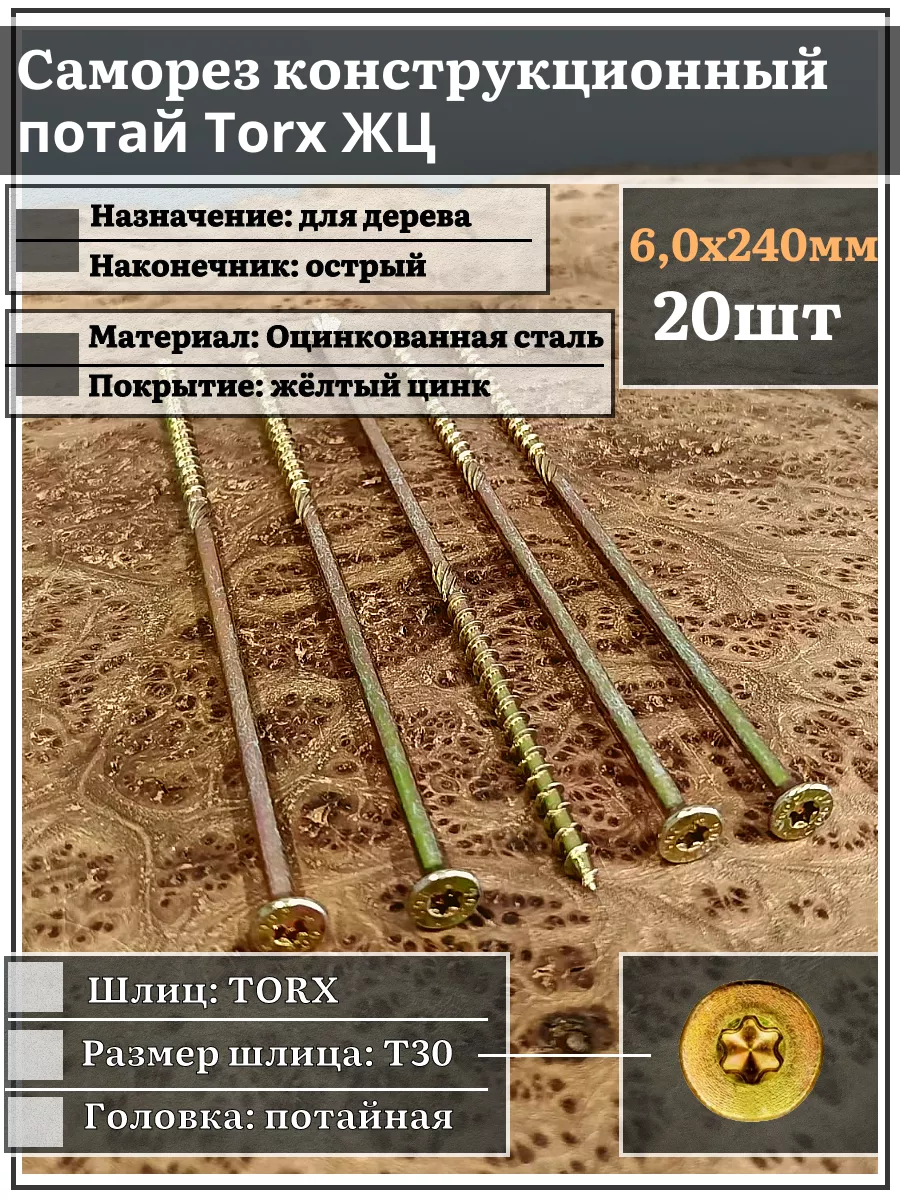 Саморез по дереву потайной Torx 6х240 ЖЦ, 20 шт.