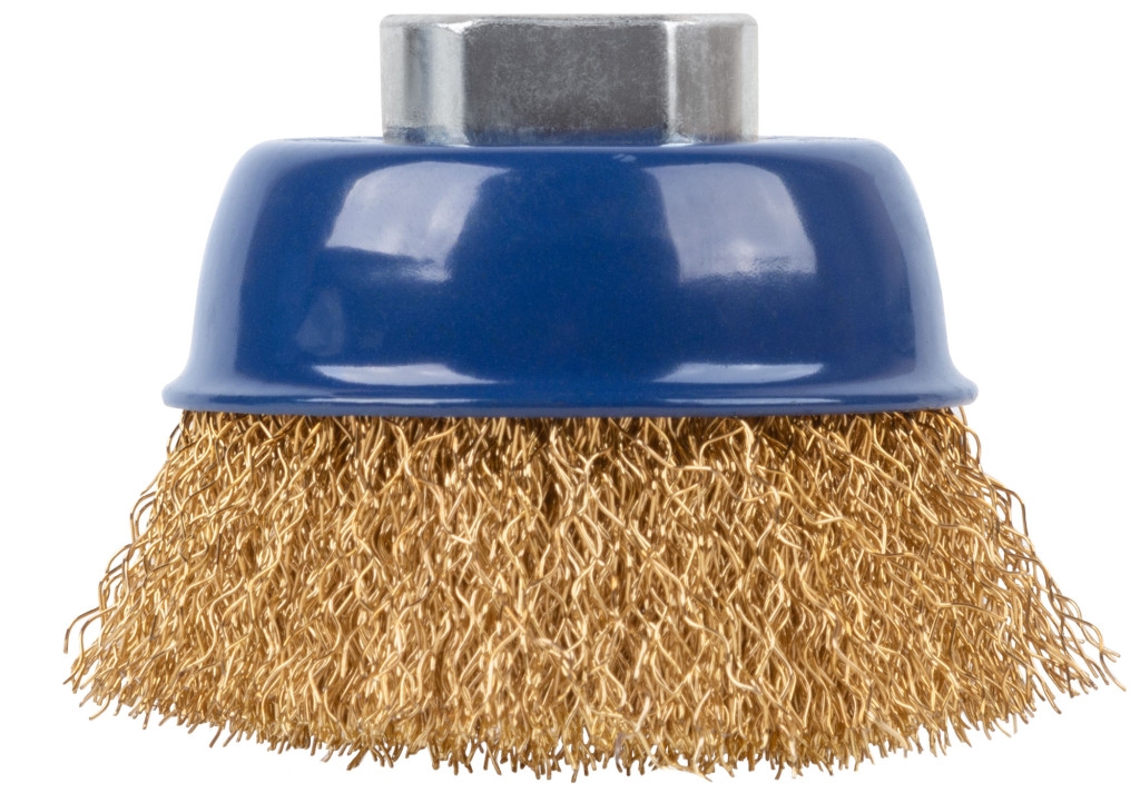 Щетка для УШМ, тип «Чашка», М14, отлично подходит для обработки больших плоскостей. Форма «Чашка» обеспечивает хорошую площадь прилегания к поверхности. Конструкция щетки оснащена усиленной гайкой с шайбой (кроме D65), которая способствует предотвращению деформации изделия. Идеальная балансировка щеток значительно продлевает срок службы инструмента.