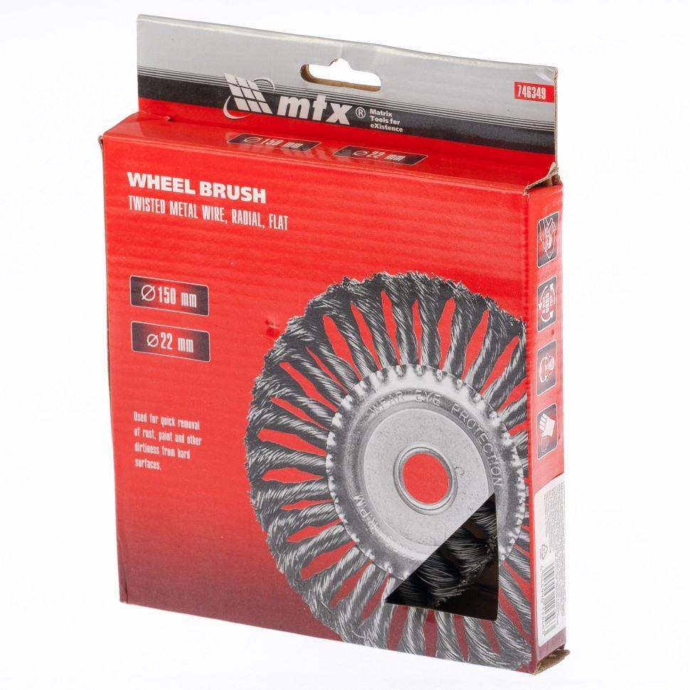 Плоская щетка Matrix 74634 диаметром 150 мм и посадкой 22,2 мм, с крученой проволокой 0,5 мм, устанавливается на вал УШМ. Щетина с крученой проволокой эффективно удаляет толстый слой ржавчины, лакокрасочных материалов и загрязнения с поверхностей при проведении грубой (черновой) обработки. Плоская форма позволяет обрабатывать труднодоступные места, в т.ч. углы и изгибы. Рекомендуется использовать щетку на оборотах не более 9000 об/мин. Преимущества За счет высококачественной нержавеющей проволоки обеспечивается долговечность щетины. Универсальная щетка рассчитана на обработку твердых поверхностей из любых материалов: металла, древесины, цветных металлов, пластика и т.д. Щетку можно использовать вне помещений, т.к. щетина покрыта маслом, а корпус оцинкован.