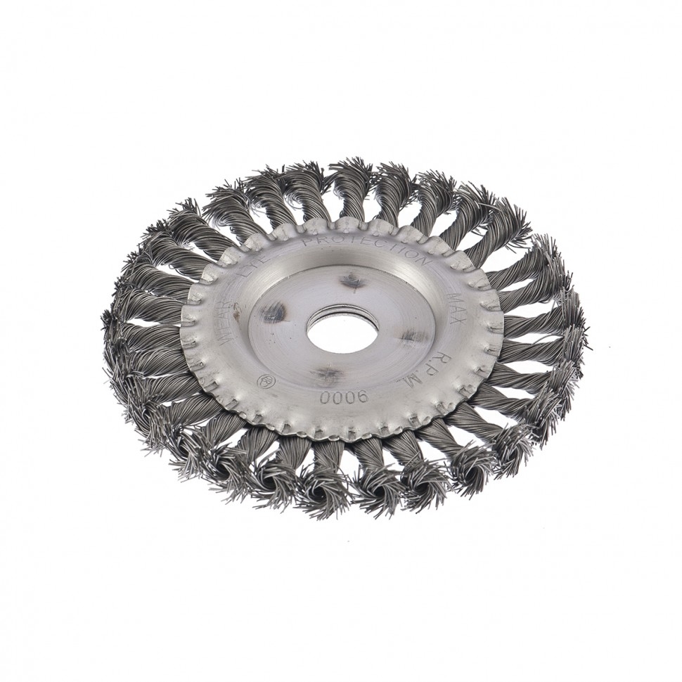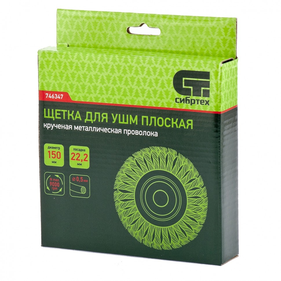 Плоская щетка Сибртех 746347 диаметром 150 мм и посадкой 22,2 мм, с крученой проволокой 0,5 мм, устанавливается на вал УШМ. Щетина с крученой проволокой эффективно удаляет толстый слой ржавчины, лакокрасочных материалов и загрязнения с поверхностей при проведении грубой (черновой) обработки. Плоская форма позволяет обрабатывать труднодоступные места, в т.ч. углы и изгибы. Рекомендуется использовать щетку на оборотах не более 9000 об/мин. Преимущества За счет высококачественной нержавеющей проволоки обеспечивается долговечность щетины. Универсальная щетка рассчитана на обработку твердых поверхностей из любых материалов: металла, древесины, цветных металлов, пластика и т.д. Щетку можно использовать вне помещений, т.к. щетина покрыта маслом, а корпус оцинкован.